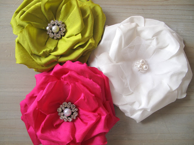These little beauties are made from 100% silk dupioni so they can be made in virtually any colour under the sun. Each petal has been hand cut, formed, treated and assembled. Due to the nature of silk dupion, the petals may fray ever so slightly with wear, but as the fabric has been treated and moulded into shape, you shouldn't expect more than the odd fray (which can just be trimmed with a sharp pair of scissors). The Lulu flowers pictured below are 4" wide however they can be made in other sizes too.