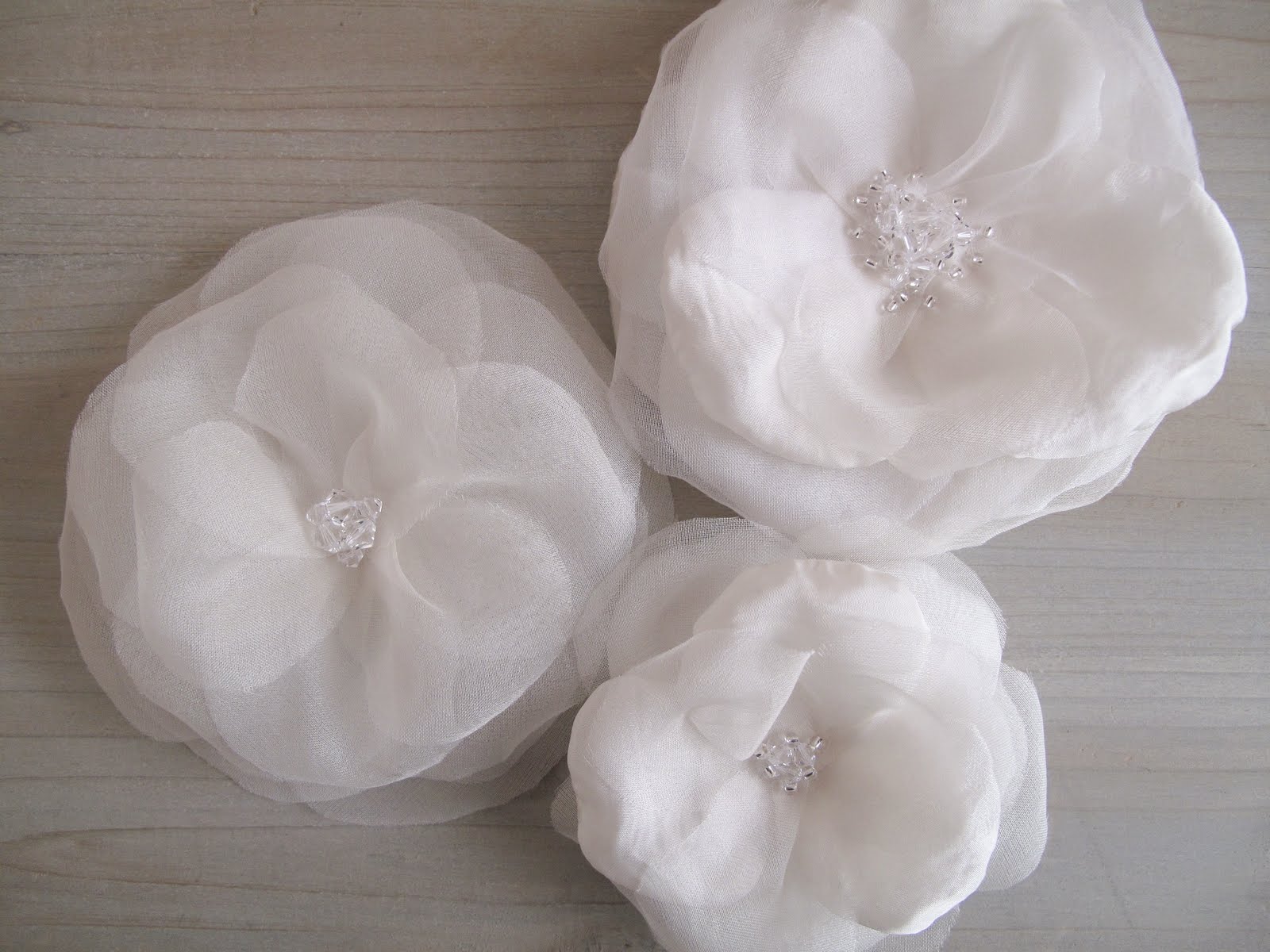 Once the store reopens I will be adding these little beauties to the shop. The opaque blossom below is a combination of silk organza and silky satin and adorned with beautiful Swarovski clear crystals and Czech silver glass beads. The two sheer blossoms are made from silk organza only and are also adorned with Swarovski crystals. As with all Percy Handmade pieces, these blossoms can be made in other sizes or colours, please contact me to discuss!