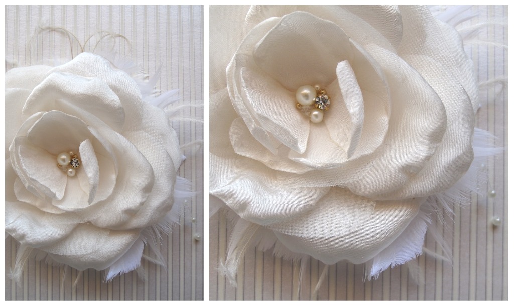 | Single ivory silky satin and silk organza flower with cluster embellishments and feathers |