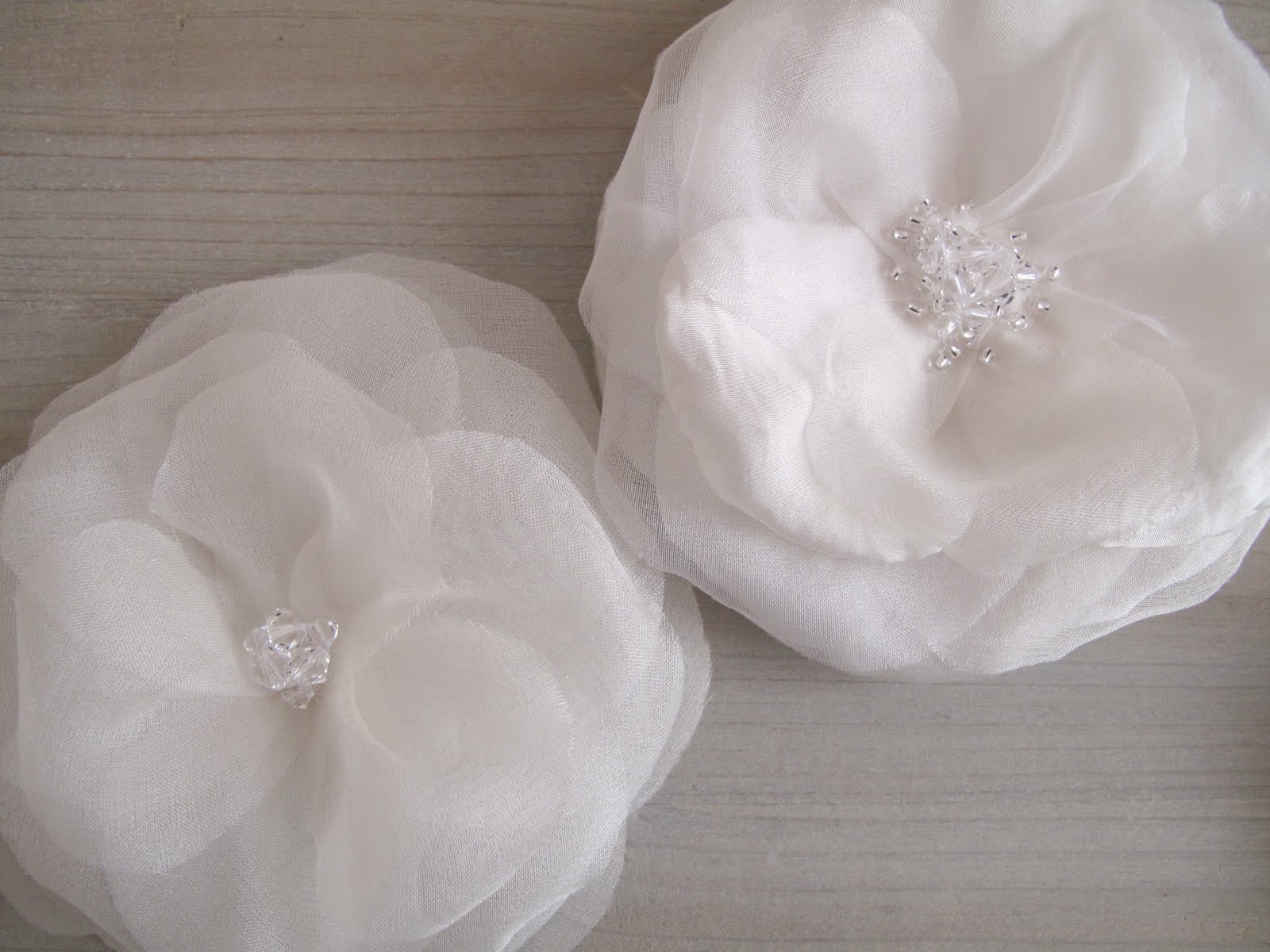 Once the store reopens I will be adding these little beauties to the shop. The opaque blossom below is a combination of silk organza and silky satin and adorned with beautiful Swarovski clear crystals and Czech silver glass beads. The two sheer blossoms are made from silk organza only and are also adorned with Swarovski crystals. As with all Percy Handmade pieces, these blossoms can be made in other sizes or colours, please contact me to discuss!